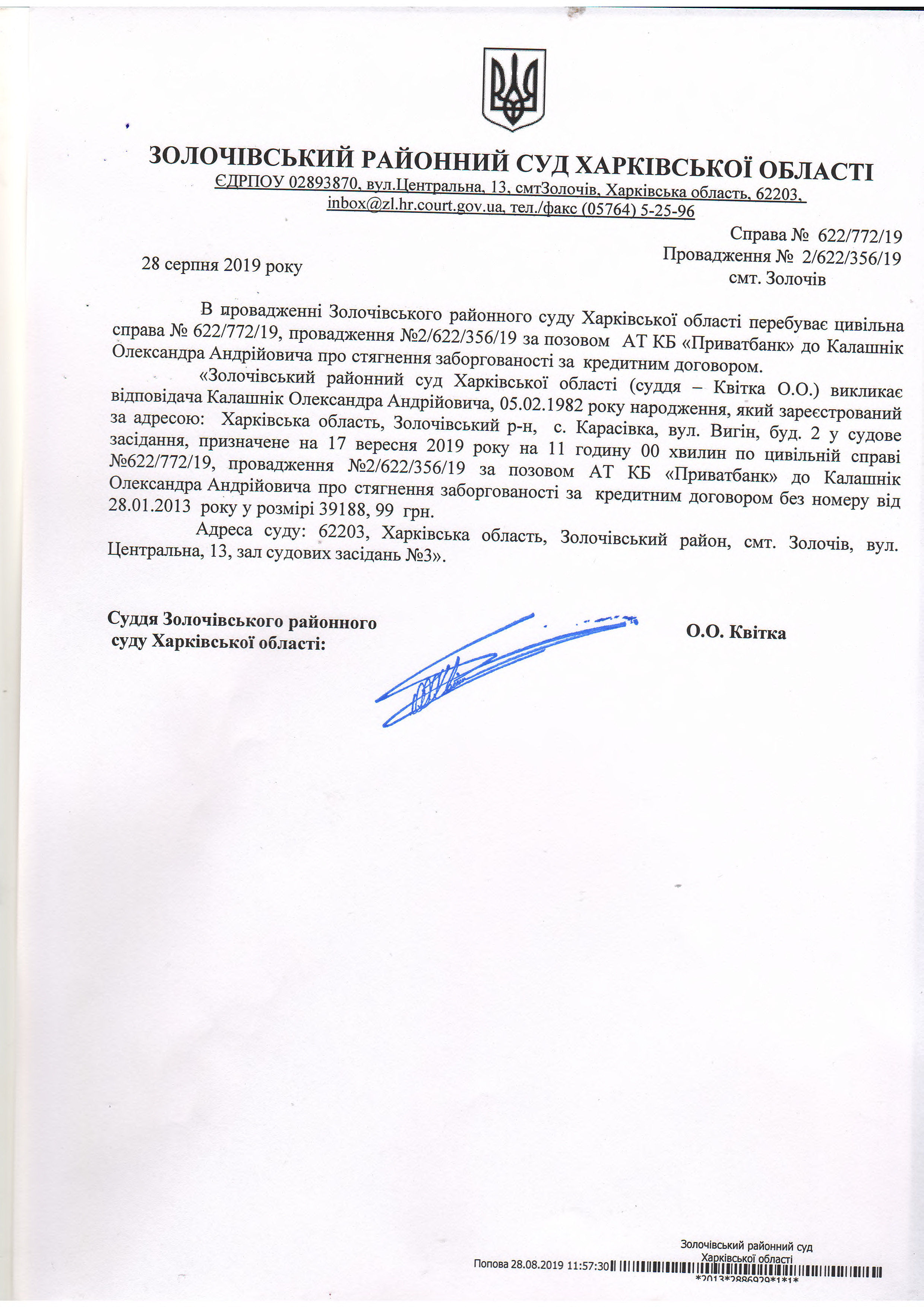 Виклик відповідача Калашніка Олександра Андрійовича до суду на 17.09.2019 року