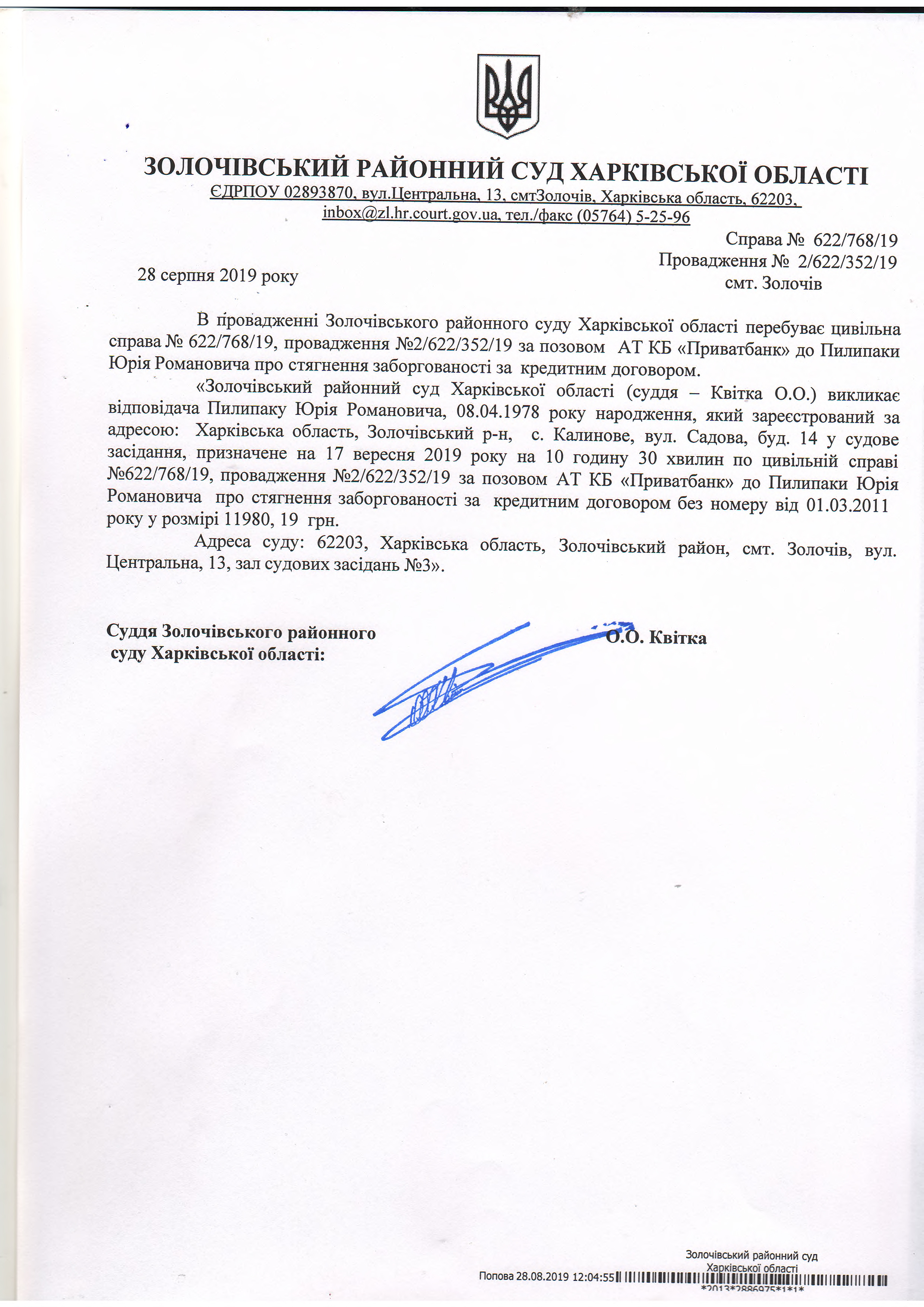Виклик відповідача Пилипак Юрія Романовича до суду на 17.09.2019 року