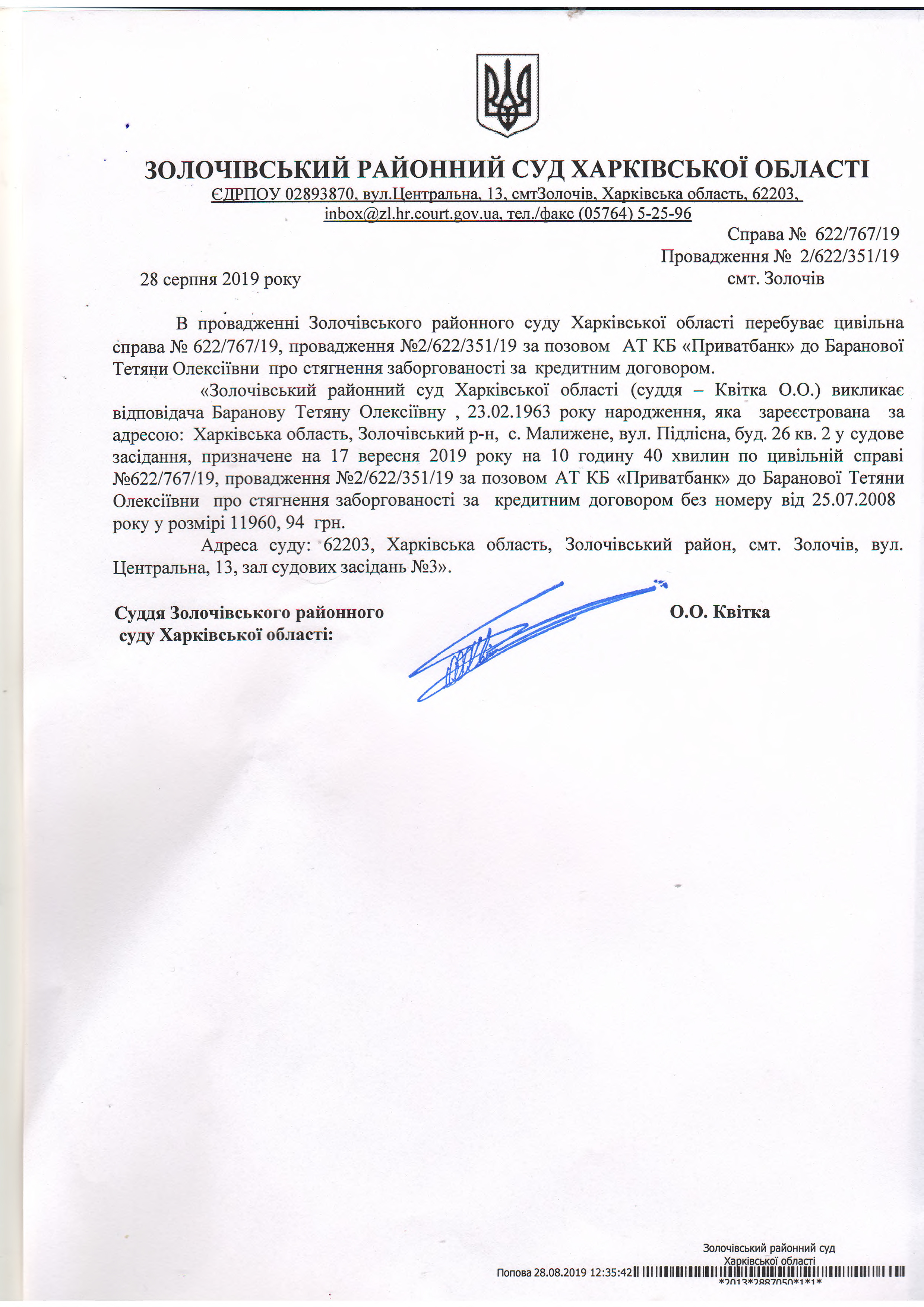Виклик відповідача Баранову Тетяну Олексіївну до суду на 17.09.2019 року