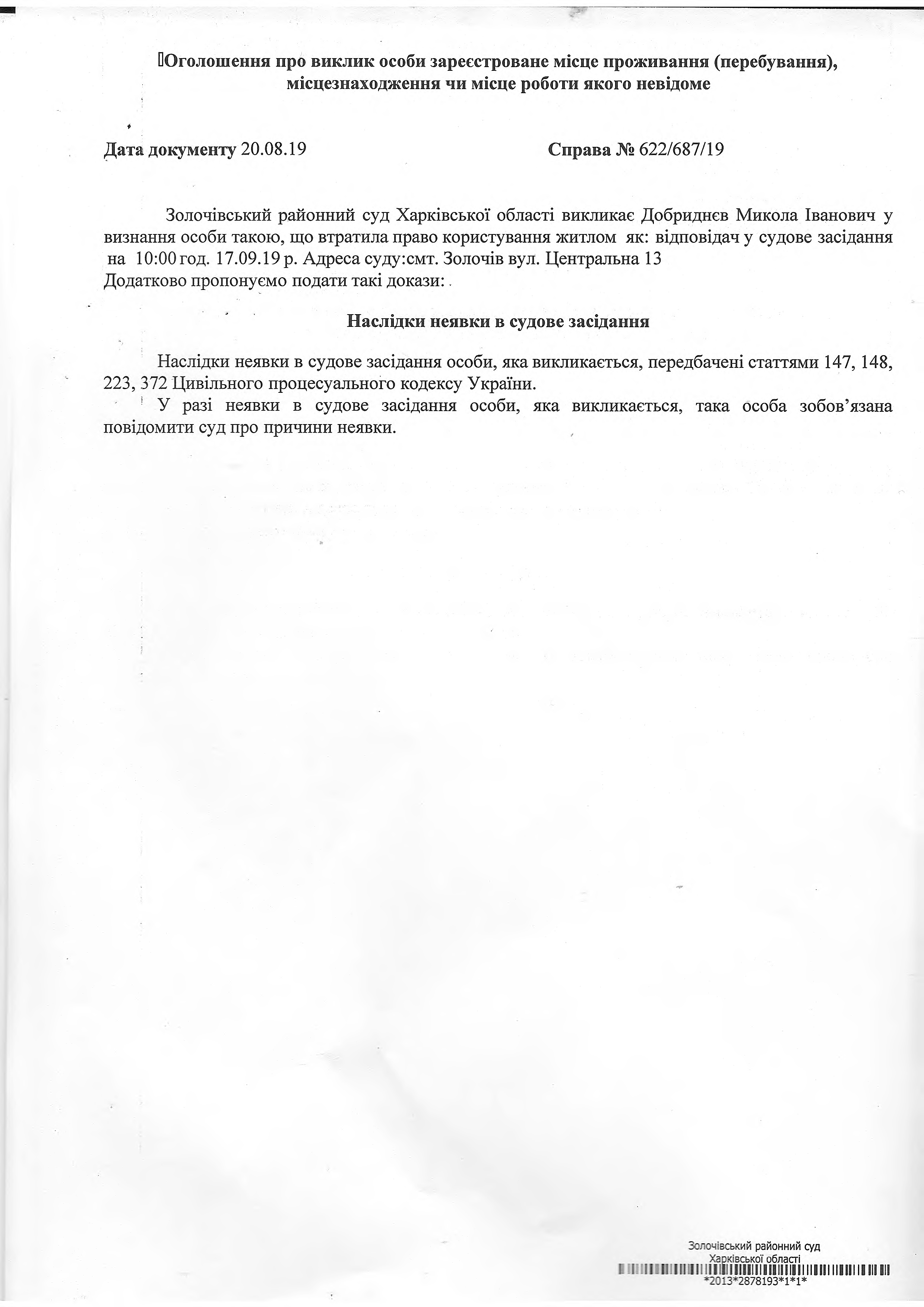 Виклик відповідача Добриднєва Миколи Івановича на 17.09.2019