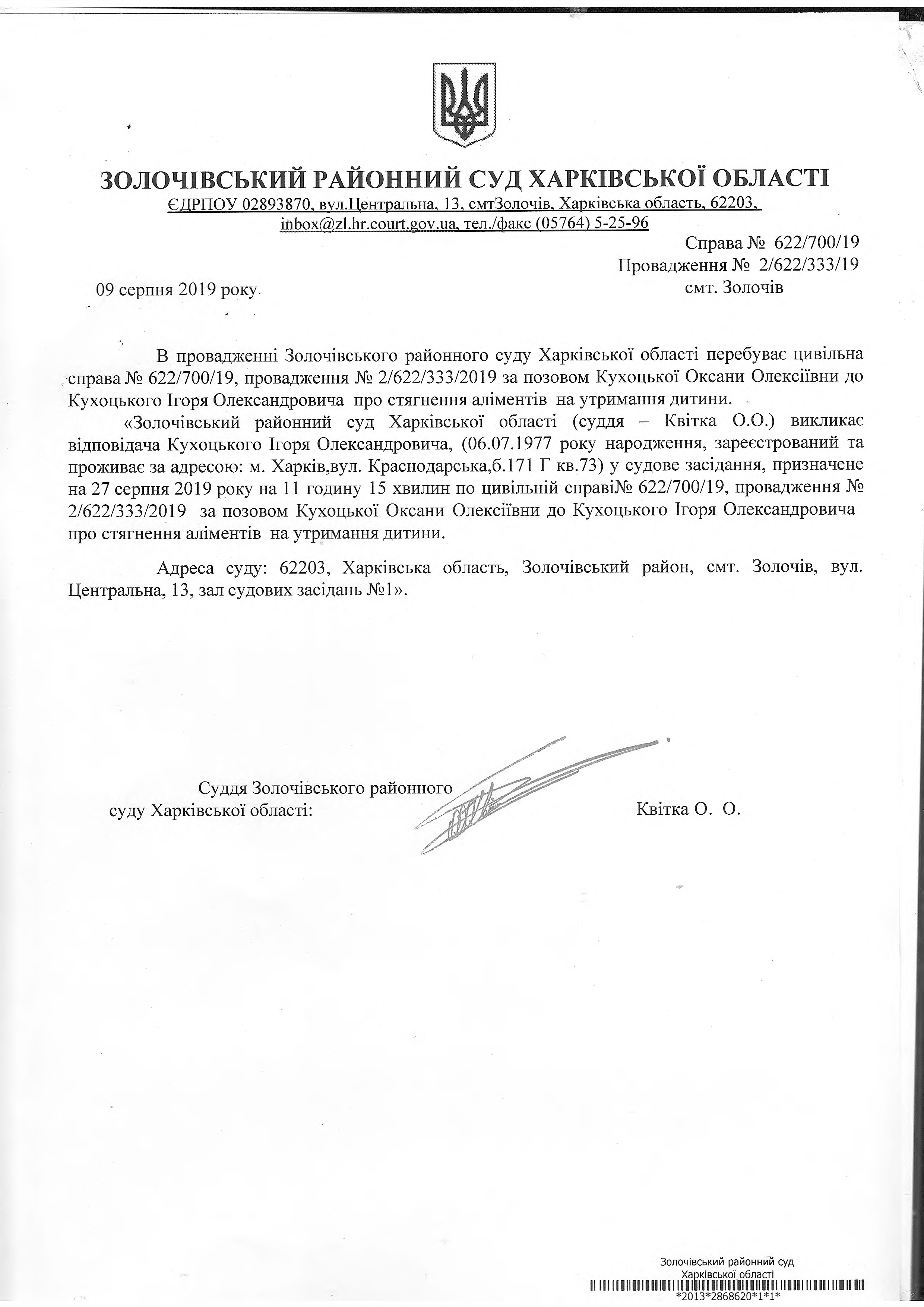 Виклик відповідача Кухоцького Ігоря Олександровича на 27.08.2019