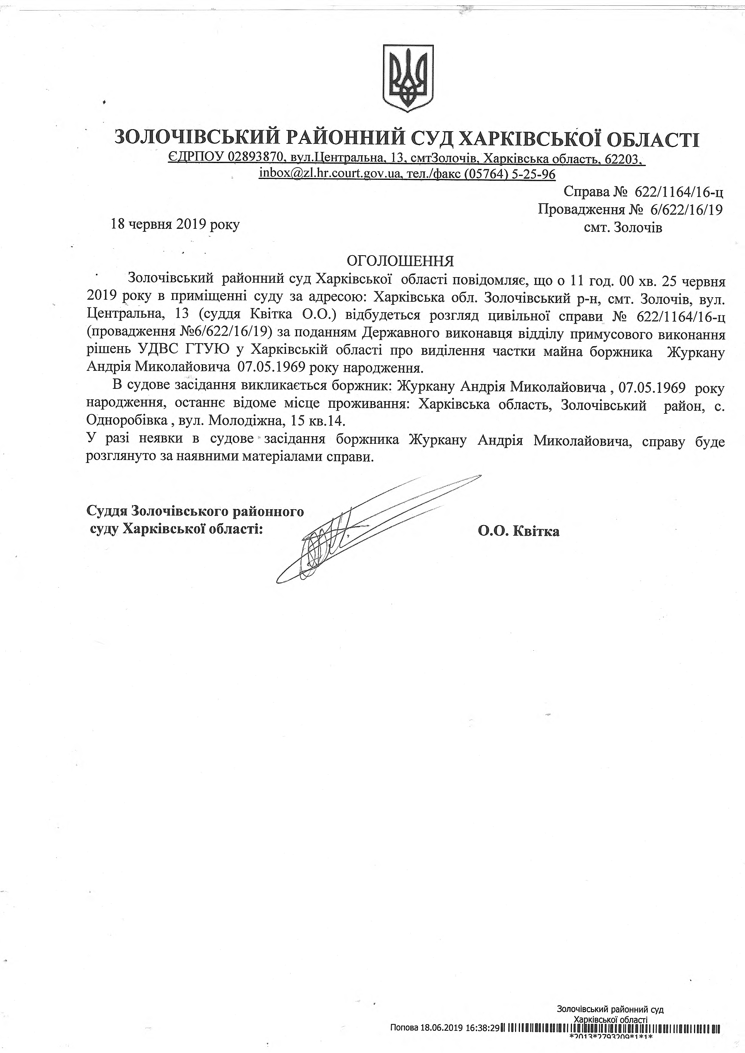Виклик боржника Журкана Андрія Миколайовича на 25 червня 2019 року