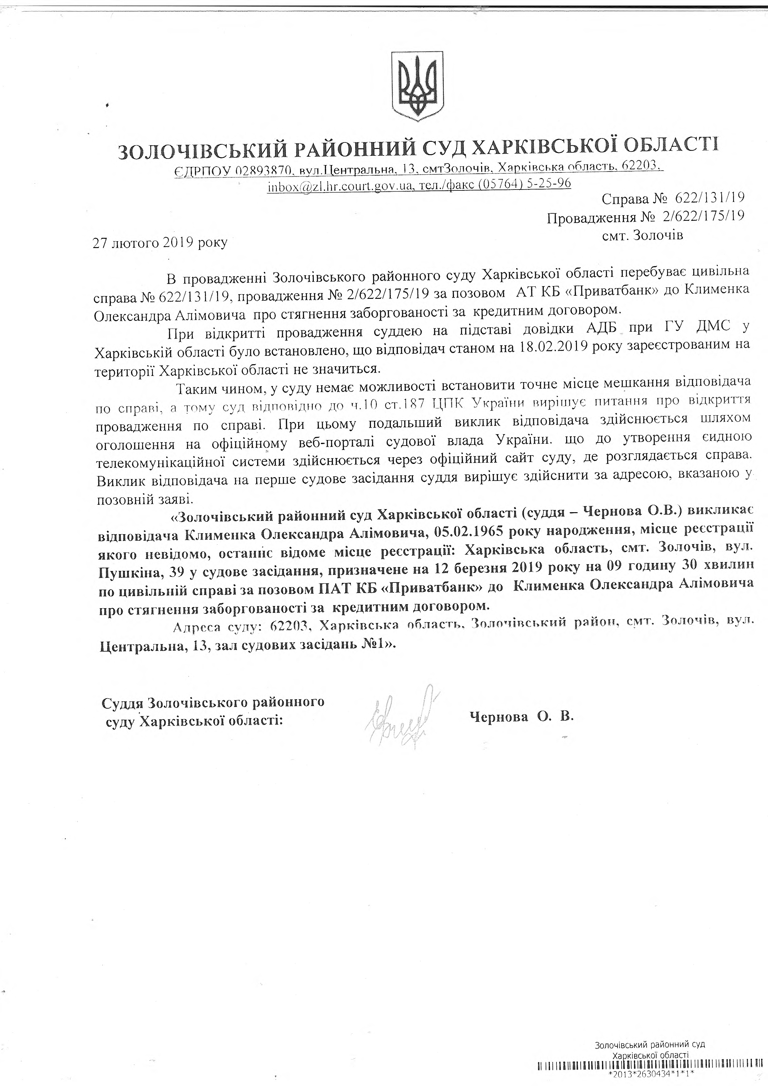 Виклик відповідача Клименка Олександра Алімовича на 12 березня 2019 року