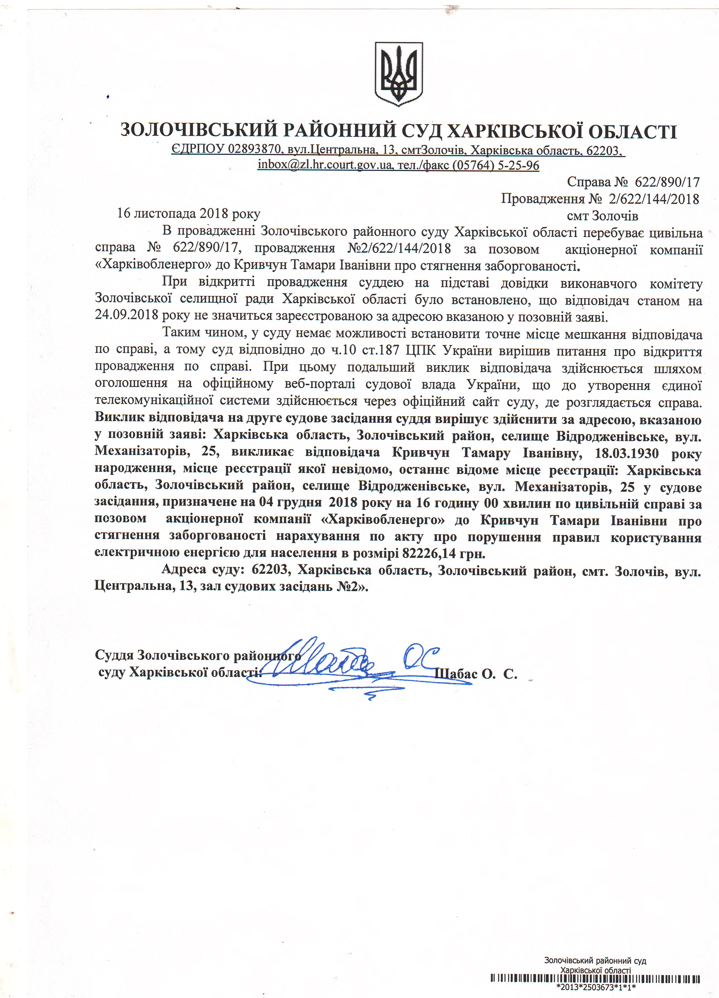 Виклик відповідача Кривчун Тамару Іванівну на 4 грудня 2018 року