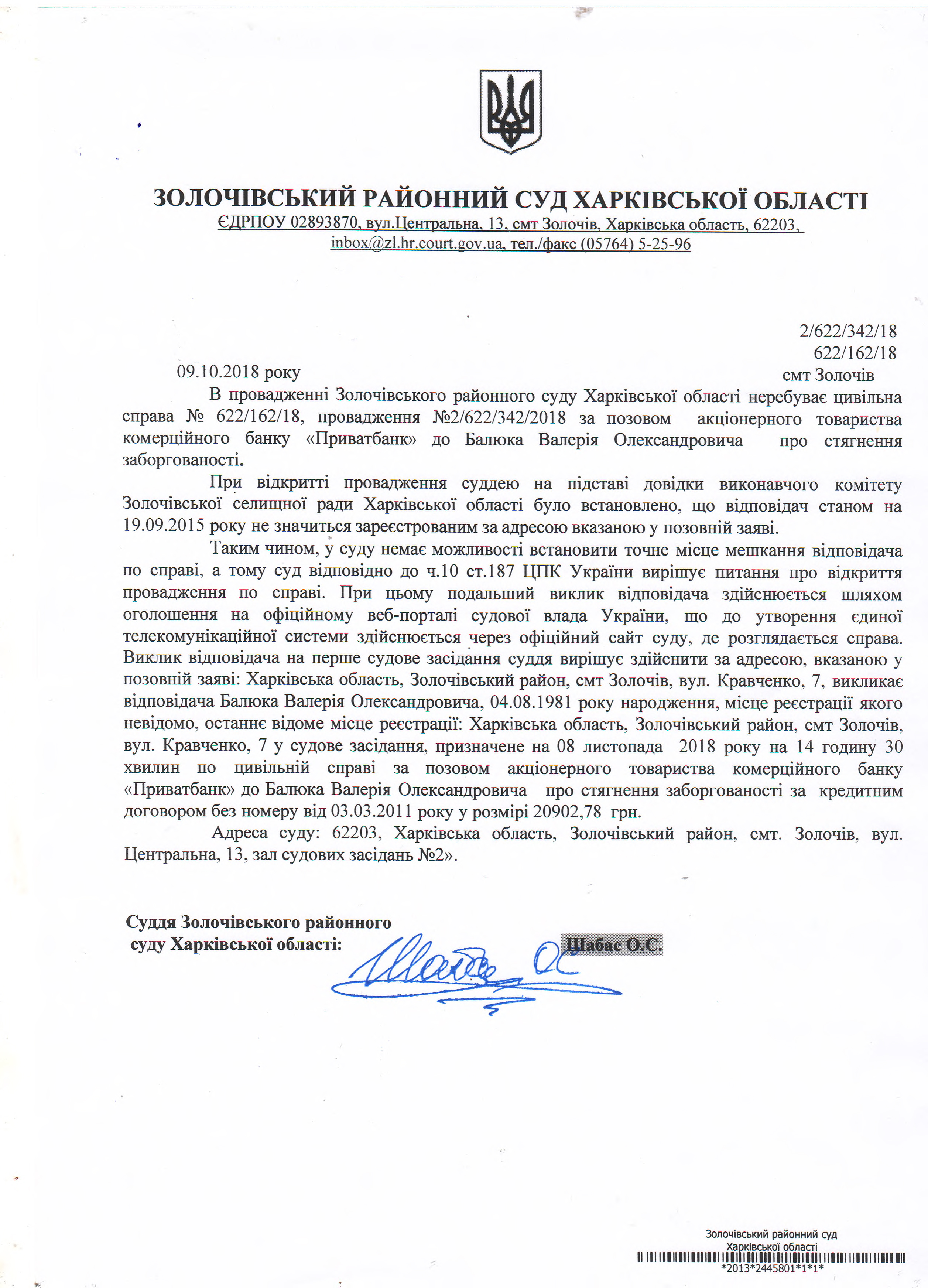 Виклик відповідача Балюка Валерія Олександровича на 8 листопада 2018 року