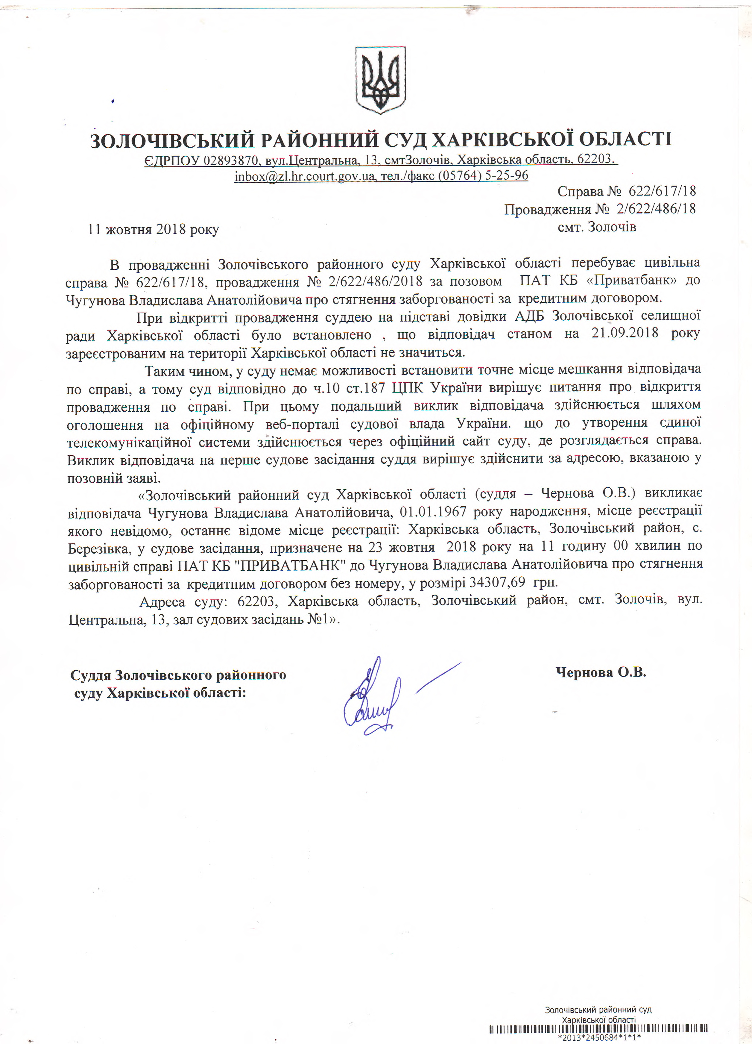 Виклик відповідача Чугунова Владислава Анатолійовича на 23 жовтня 2018 року
