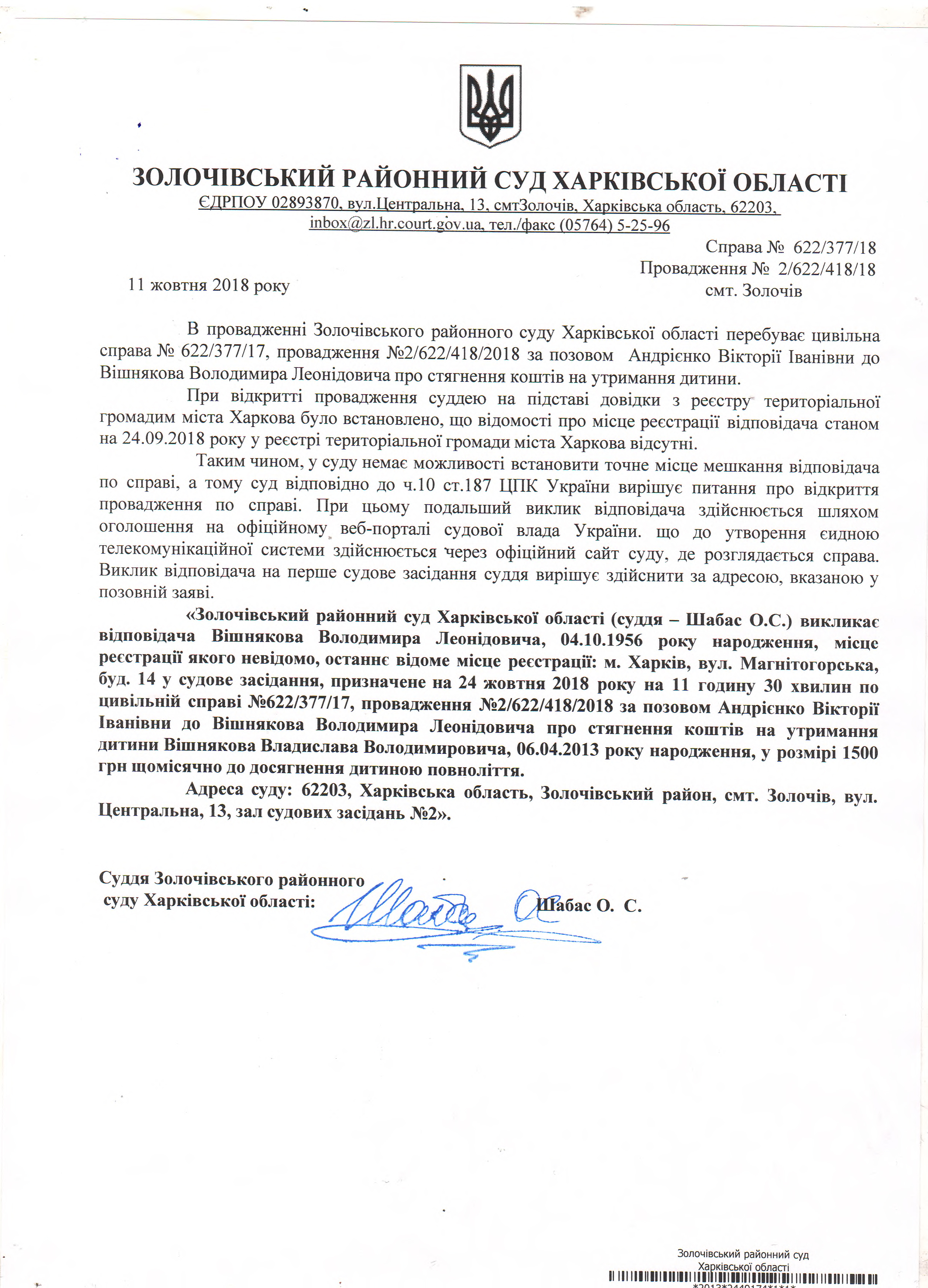 Виклик відповідача Вішнякова Володимира Леонідовича на 24 жовтня 2018 року