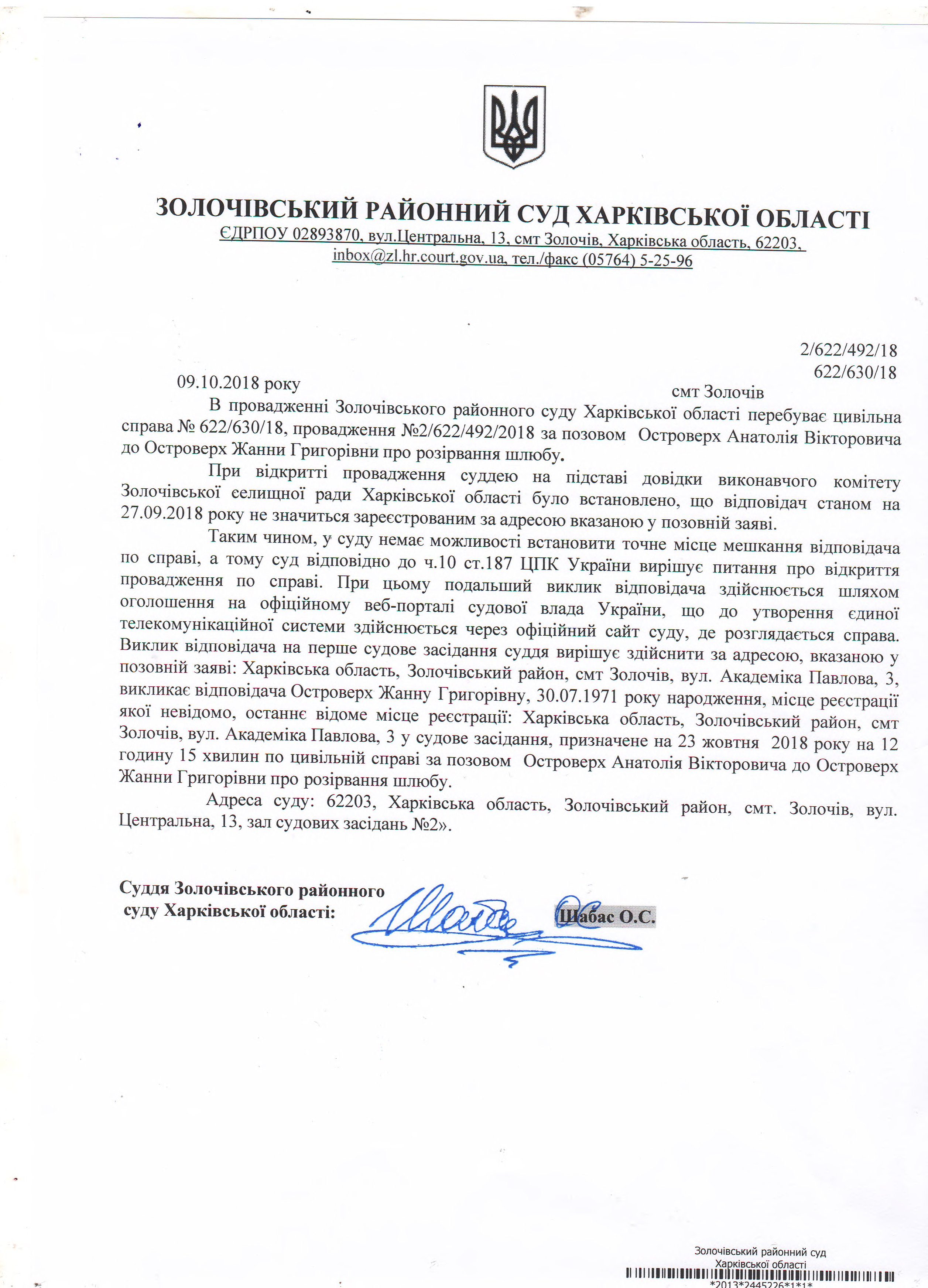 Виклик відповідача Островерх Жанну Григорівну на 23 жовтня 2018 року