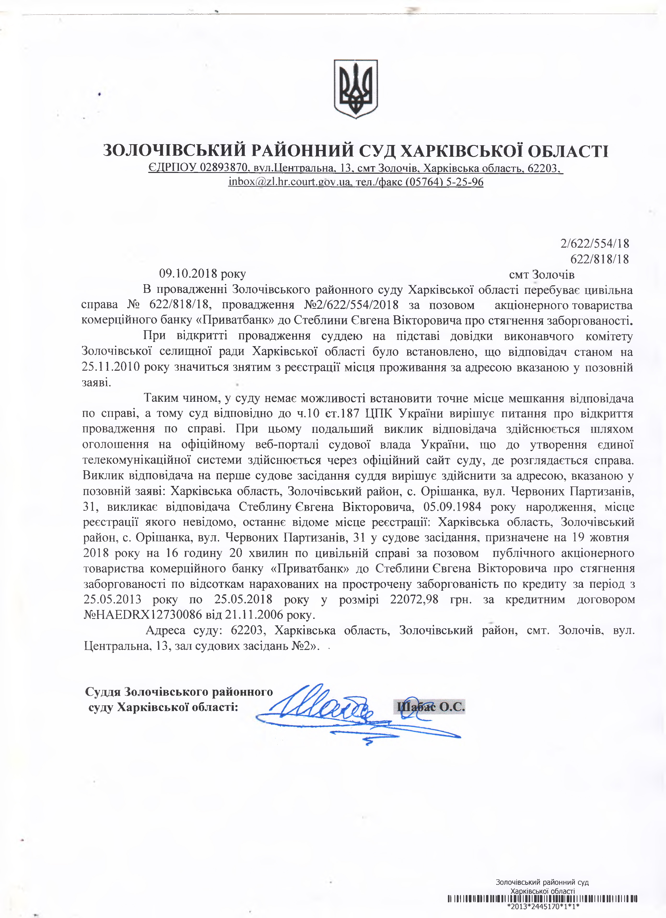 Виклик відповідача Стеблину Євгена Вікторовича на 19 жовтня 2018 року