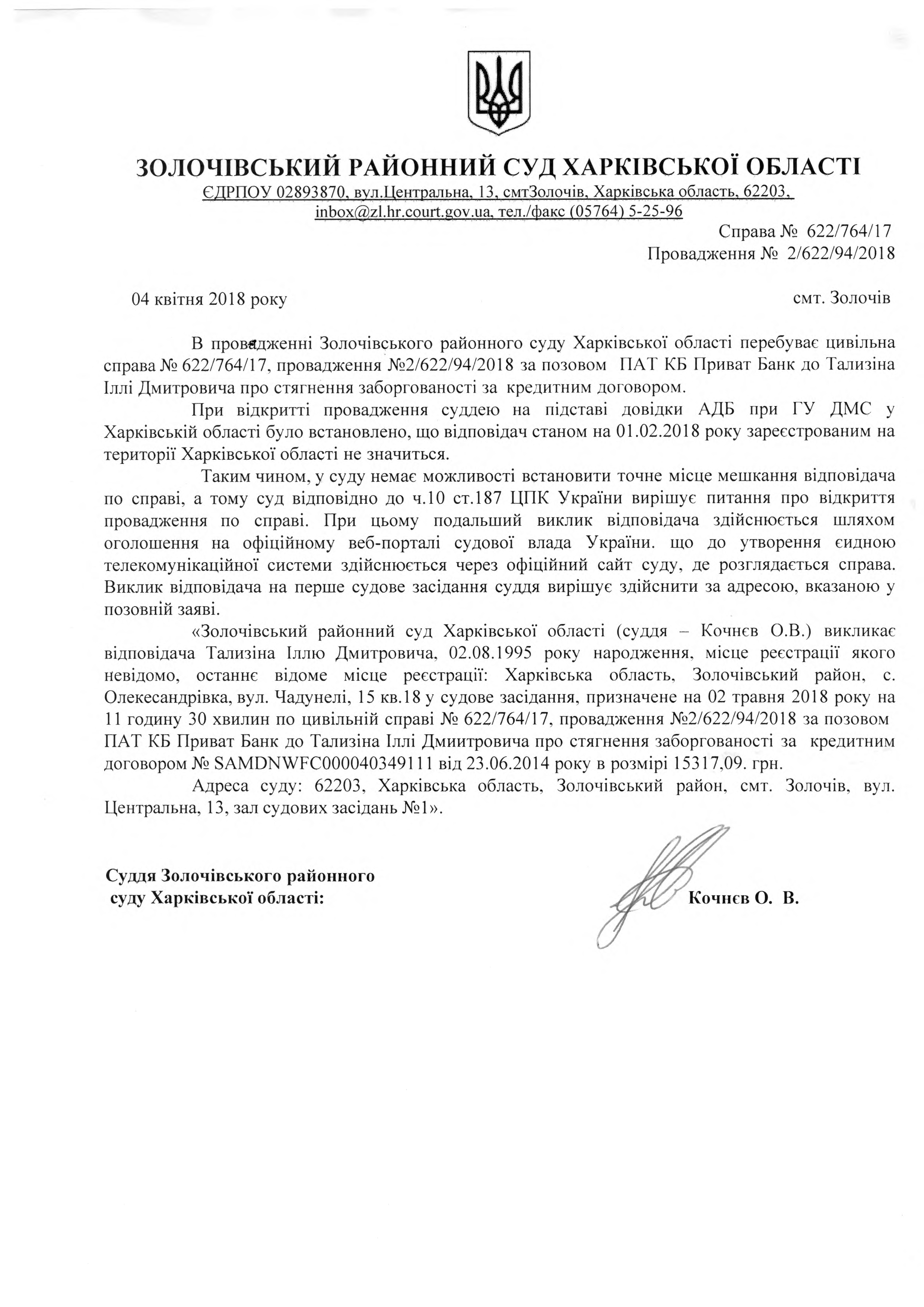 Виклик відповідача Тализіна Іллю Дмитровича на 02 травня 2018р. по справі №622/764/17