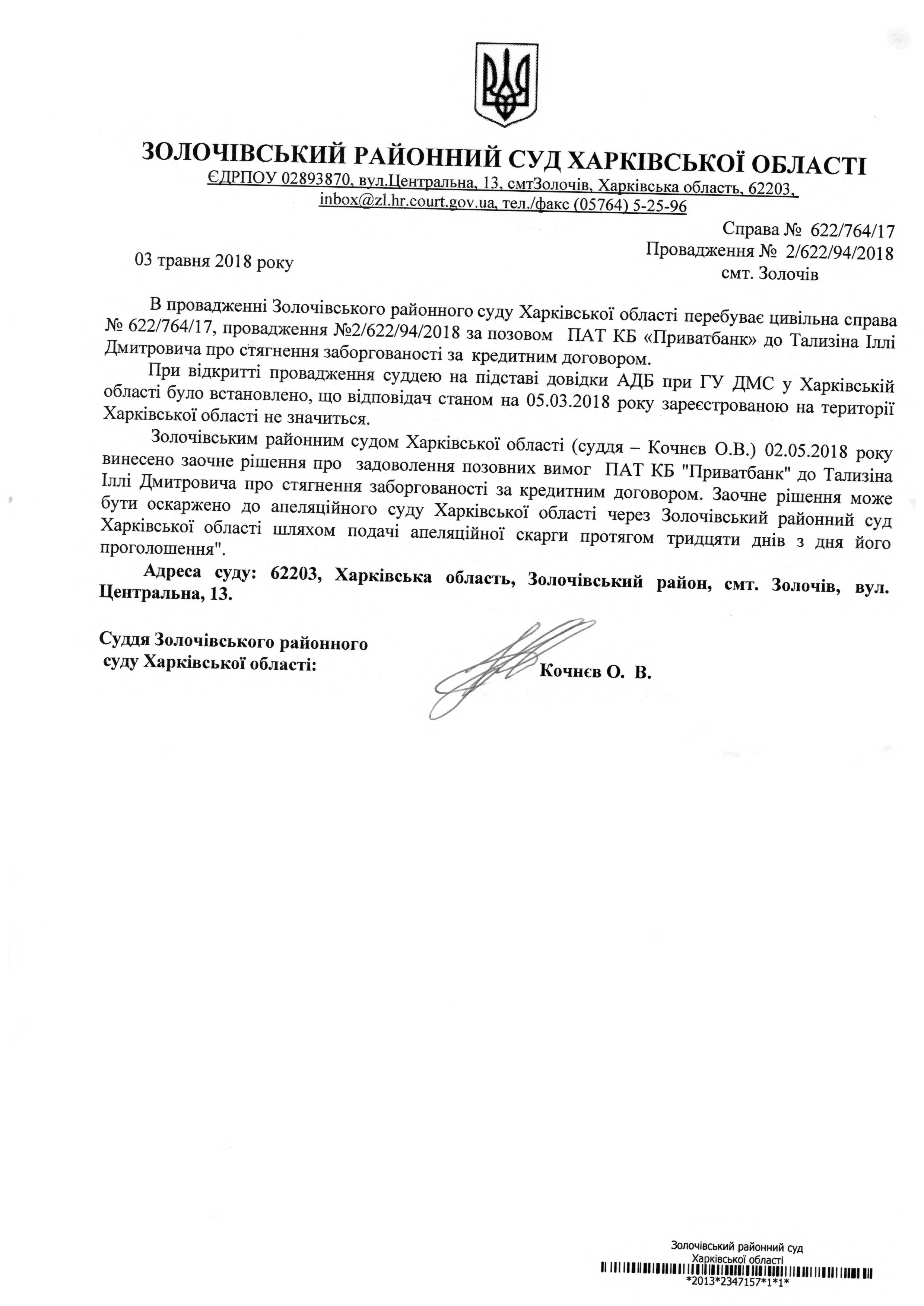 Винесено заочне рішення по справі за позовом ПАТ КБ "ПриватБанк" до Тализіна І.Д.
