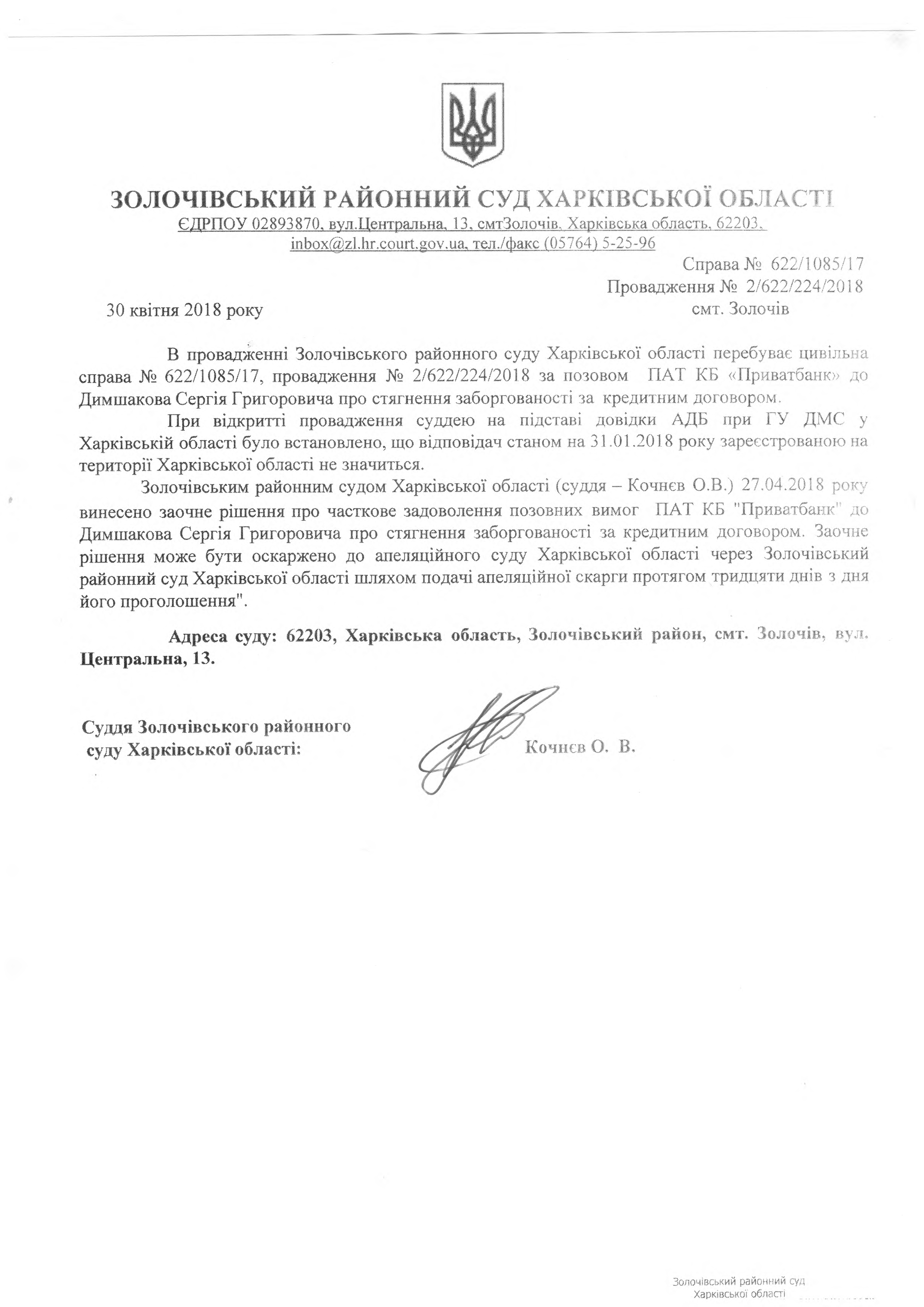 Винесено заочне рішення по справі за позовом ПАТ КБ "ПриватБанк" до Димшакова С.Г