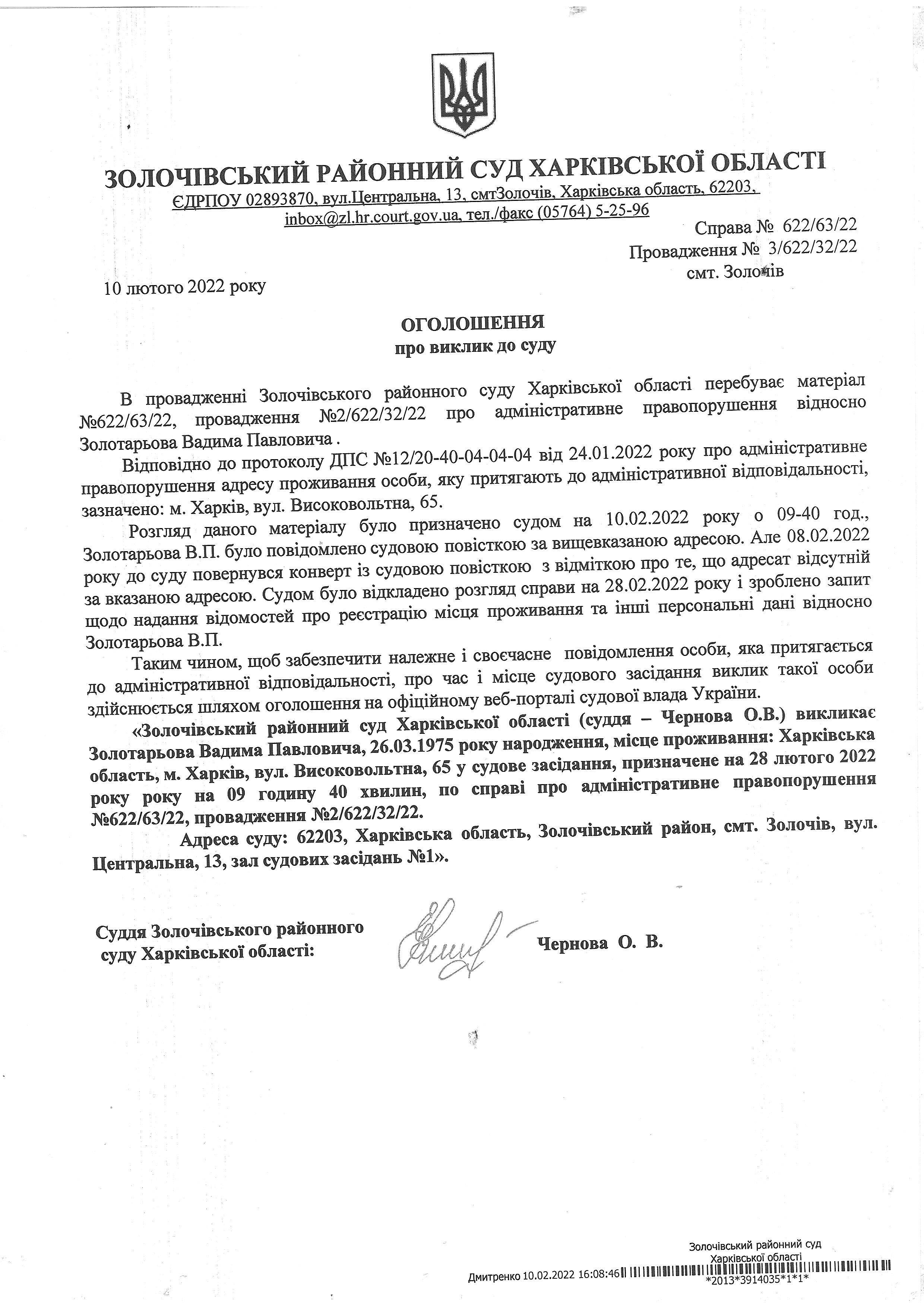 Виклик до суду Золотарьова Вадима Павловича на 28 лютого 2022 року