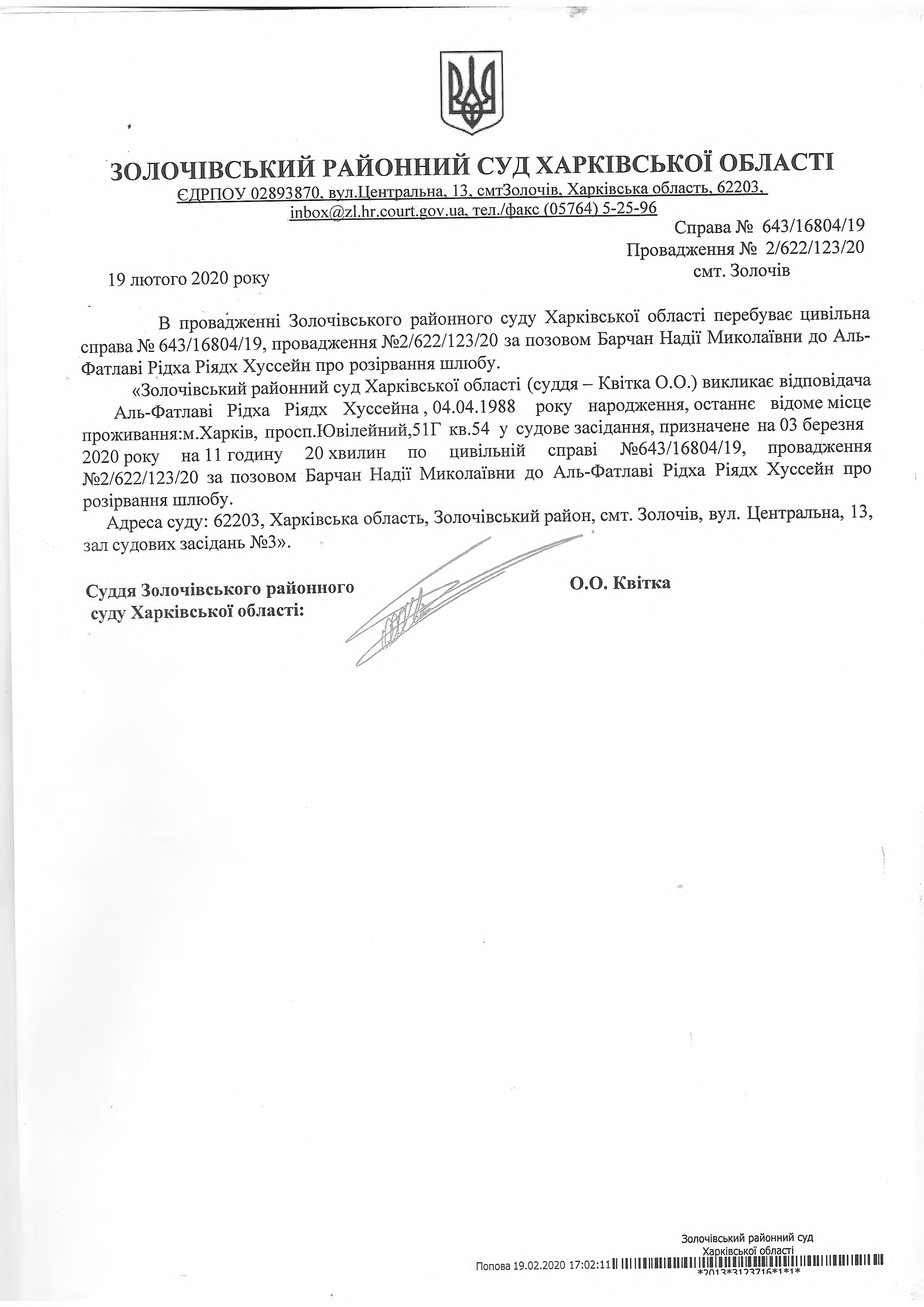 Виклик до суду відповідача Аль-Фатлаві Рідха Ріядх Хуссейна на 3 березня 2020