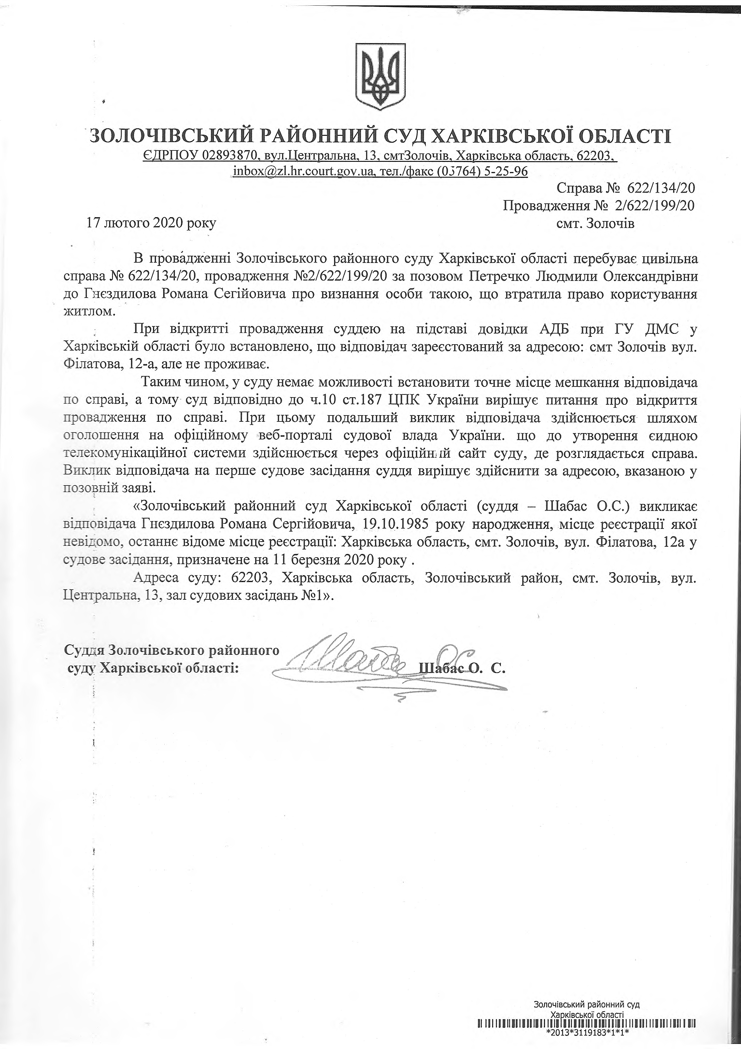 Увага! Суд не здійснює правосуддя. Підсудність змінено на Дергачівський районний суд Харківської області