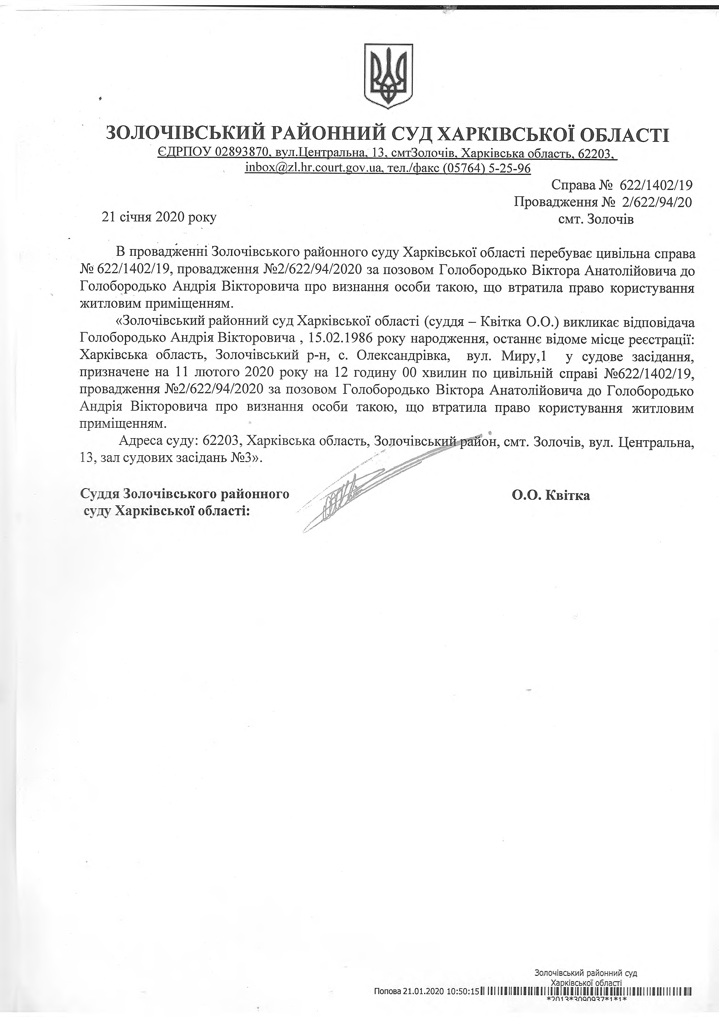 Виклик до суду відповідача Голобородько Адрія Вікторовича на 11 лютого 2020