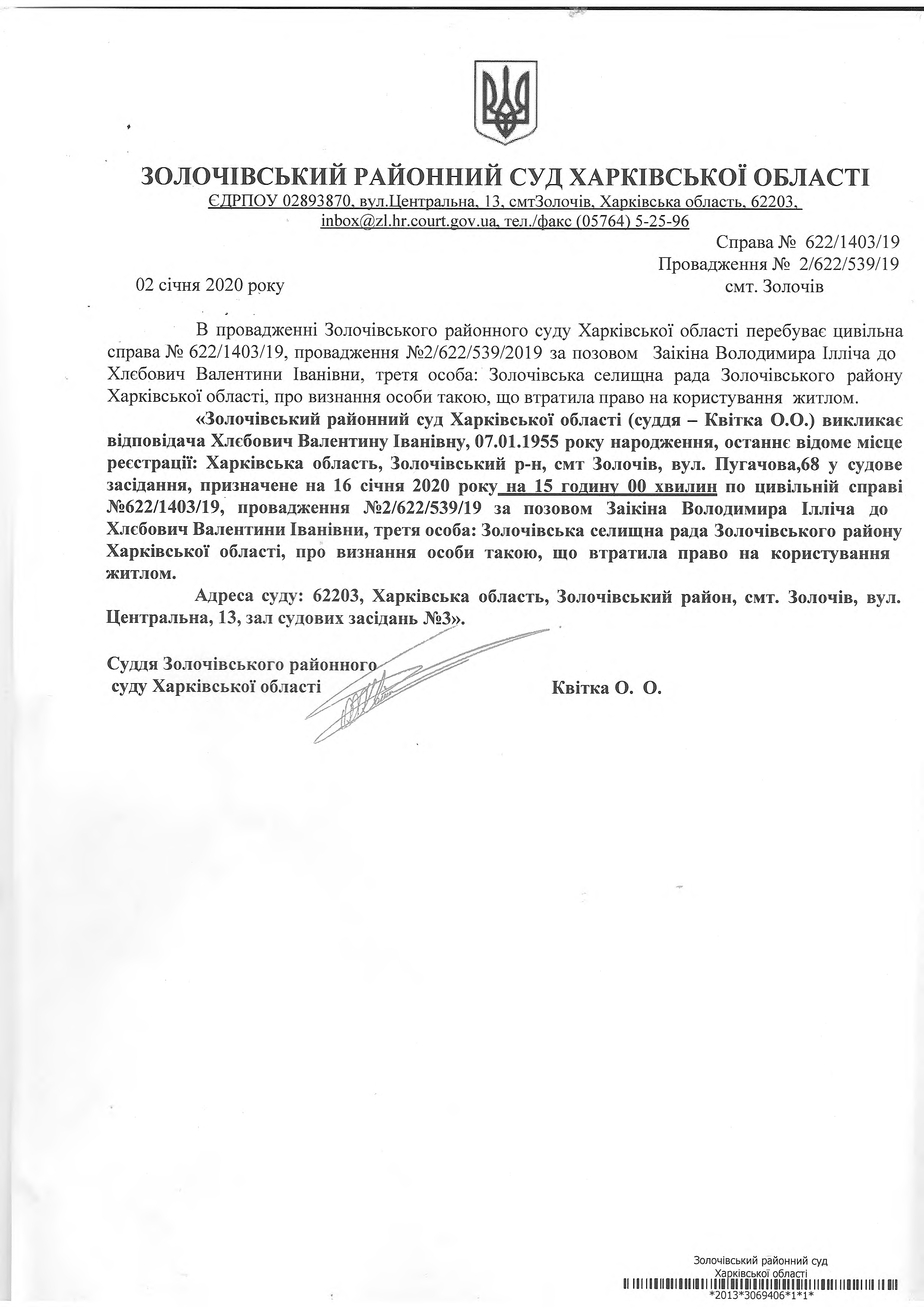 Виклик до суду відповідача Хлєбович Валентину Іванівну на 16.01.2020