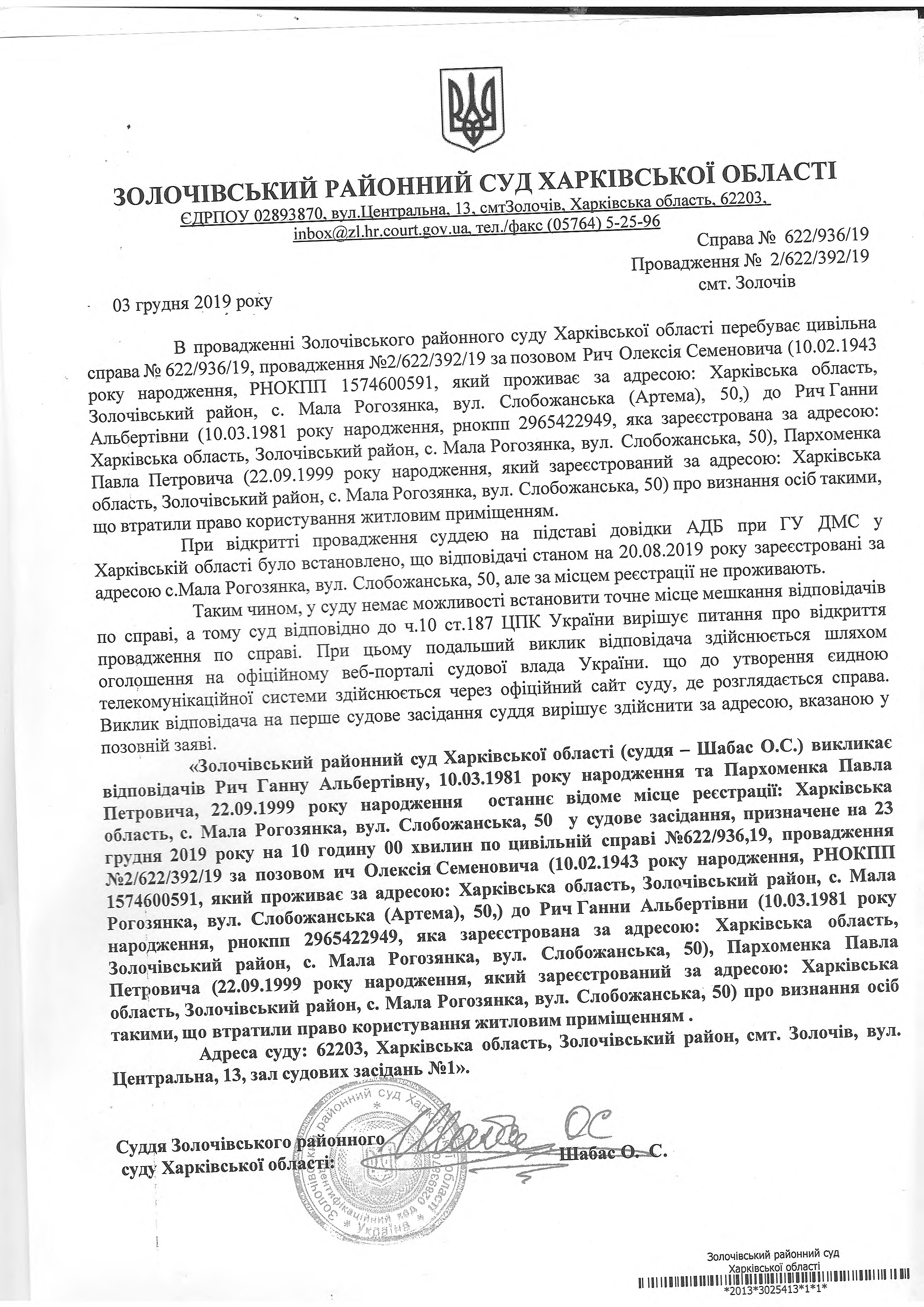 Виклик до суду відповідача Рич Ганну Альбертівну на 23.12.2019