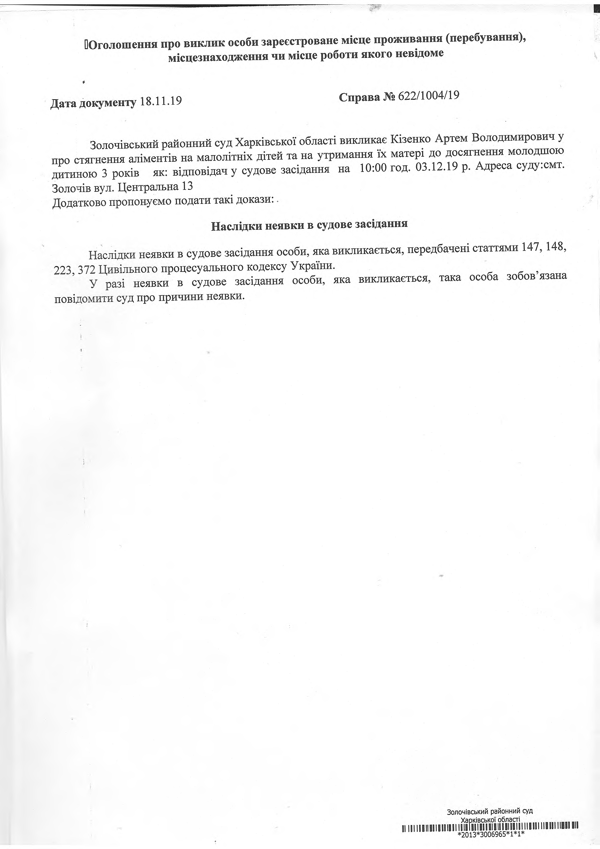Виклик до суду Кізенко Артема Володимировича на 03.12.2019