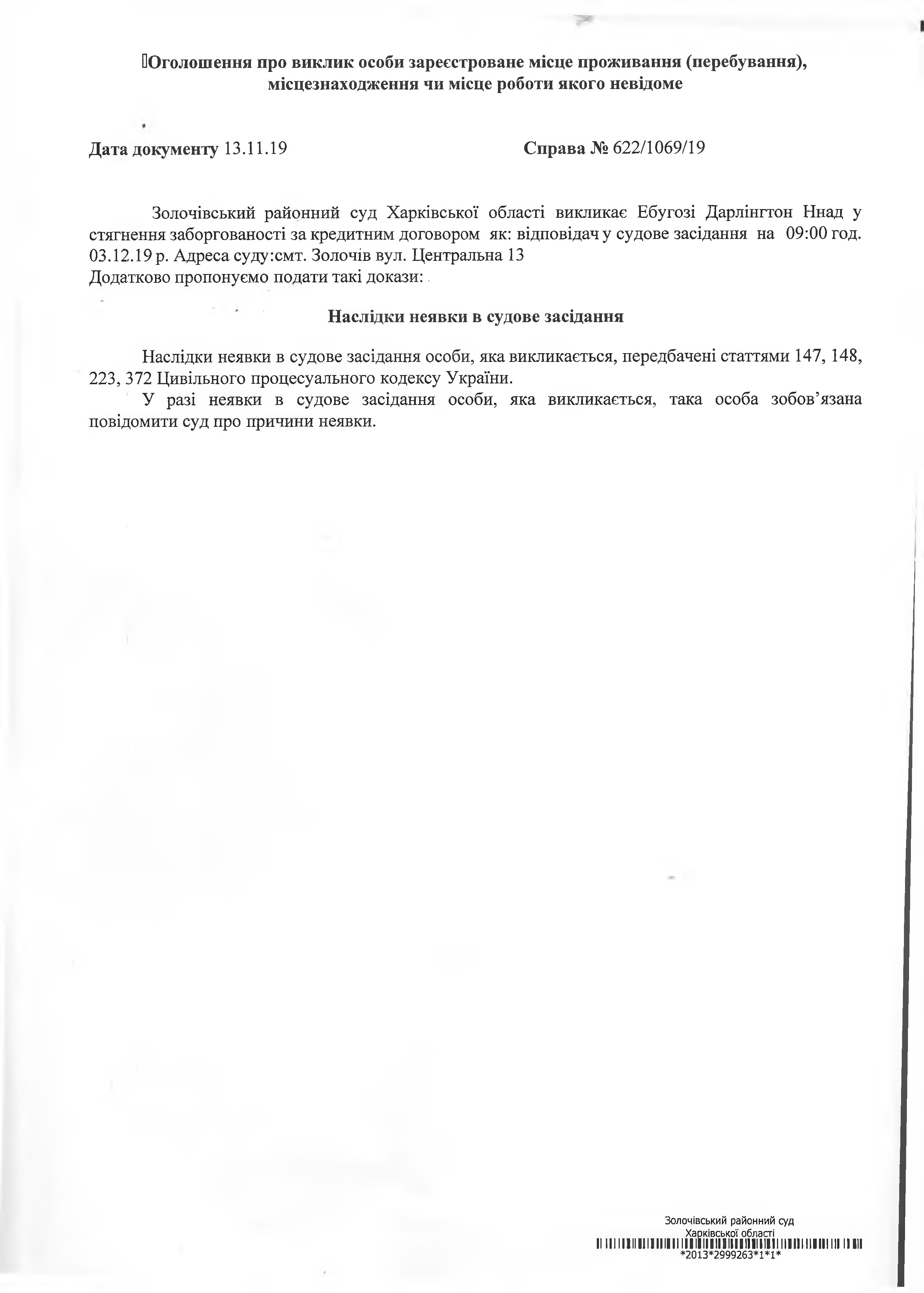 Виклик до суду відповідача Єбугозу Дарлінгтон Ннад на 03.12.2019