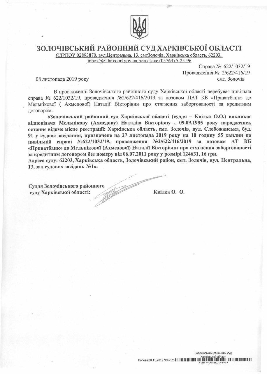 Виклик до суду відповідача Мельнікової (Ахмедової) Наталії Вікторівни на 27 листопада 2019 року