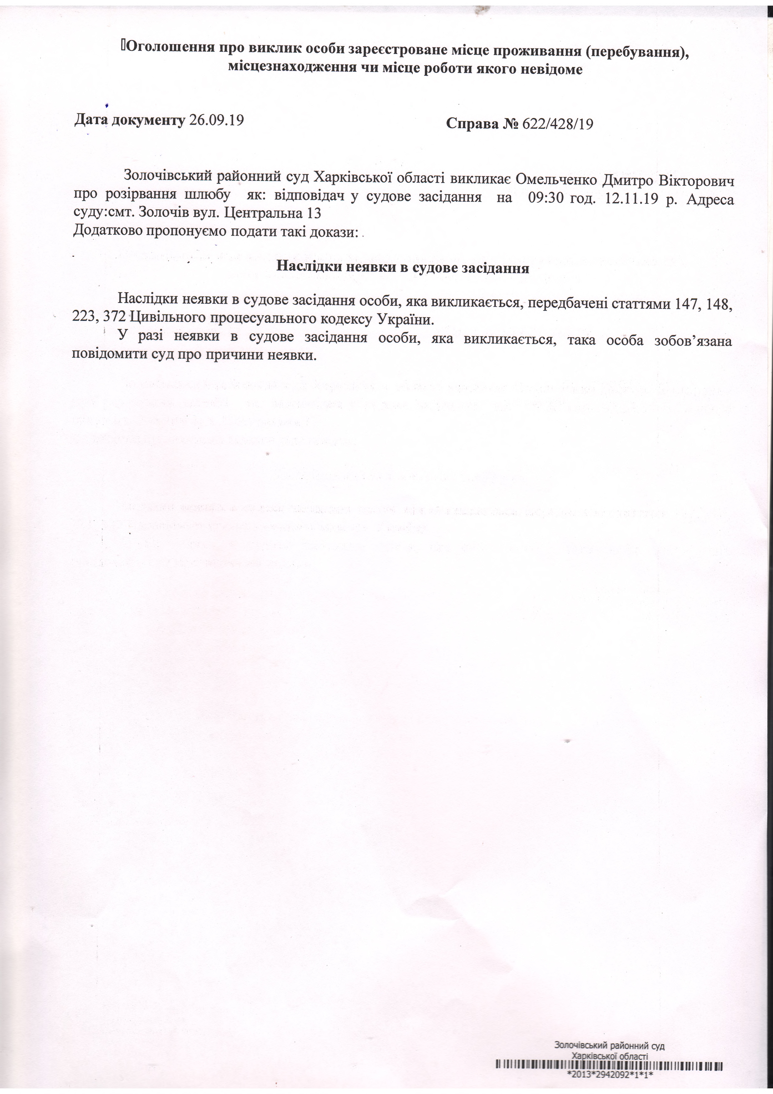 Виклик Омельченко Дмитра Вікторовича на 12 листопада 2019 року