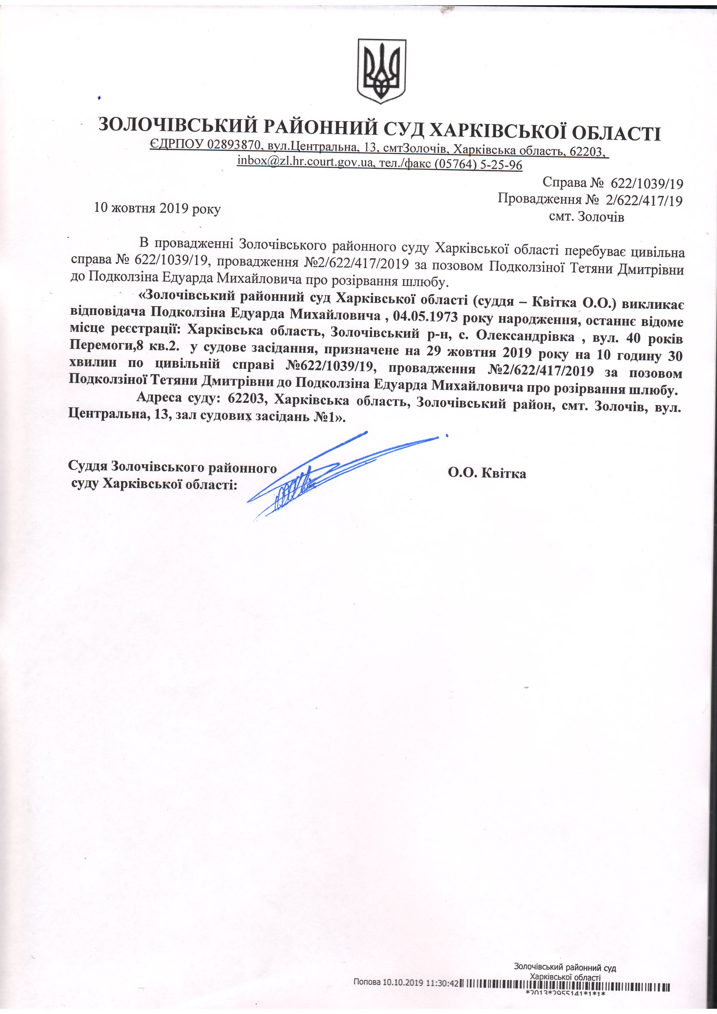 Виклик відповідача Подколзіна Єдуарда Михайловича на 29 жовтня 2019 року