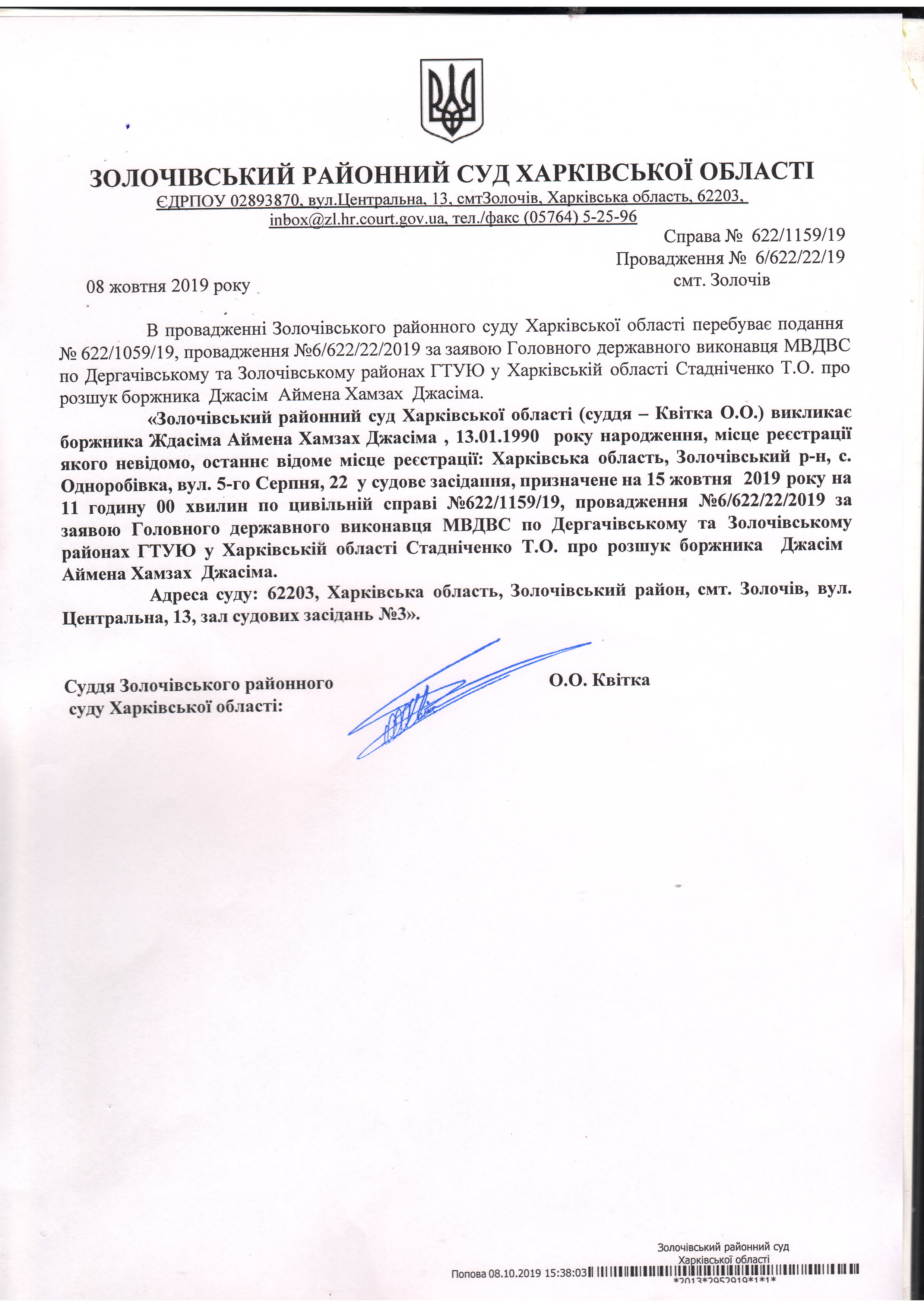 Виклик боржника Ждасіма Аймена Хамзах Джасіма на 15 жовтня 2019 року
