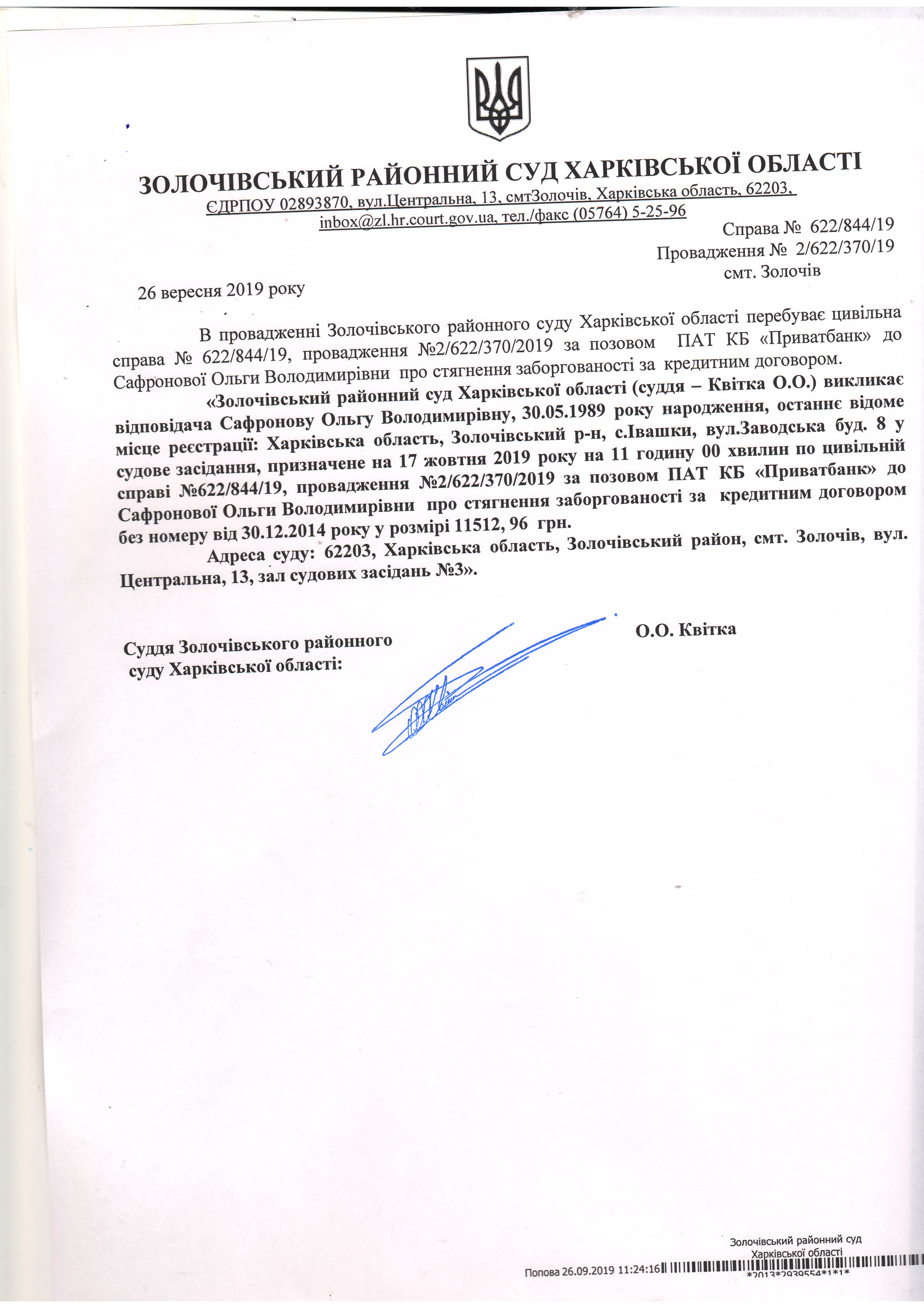 Виклик відповідача Сафронову Ольгу Володимирівну на 17 жовтня 2019 року