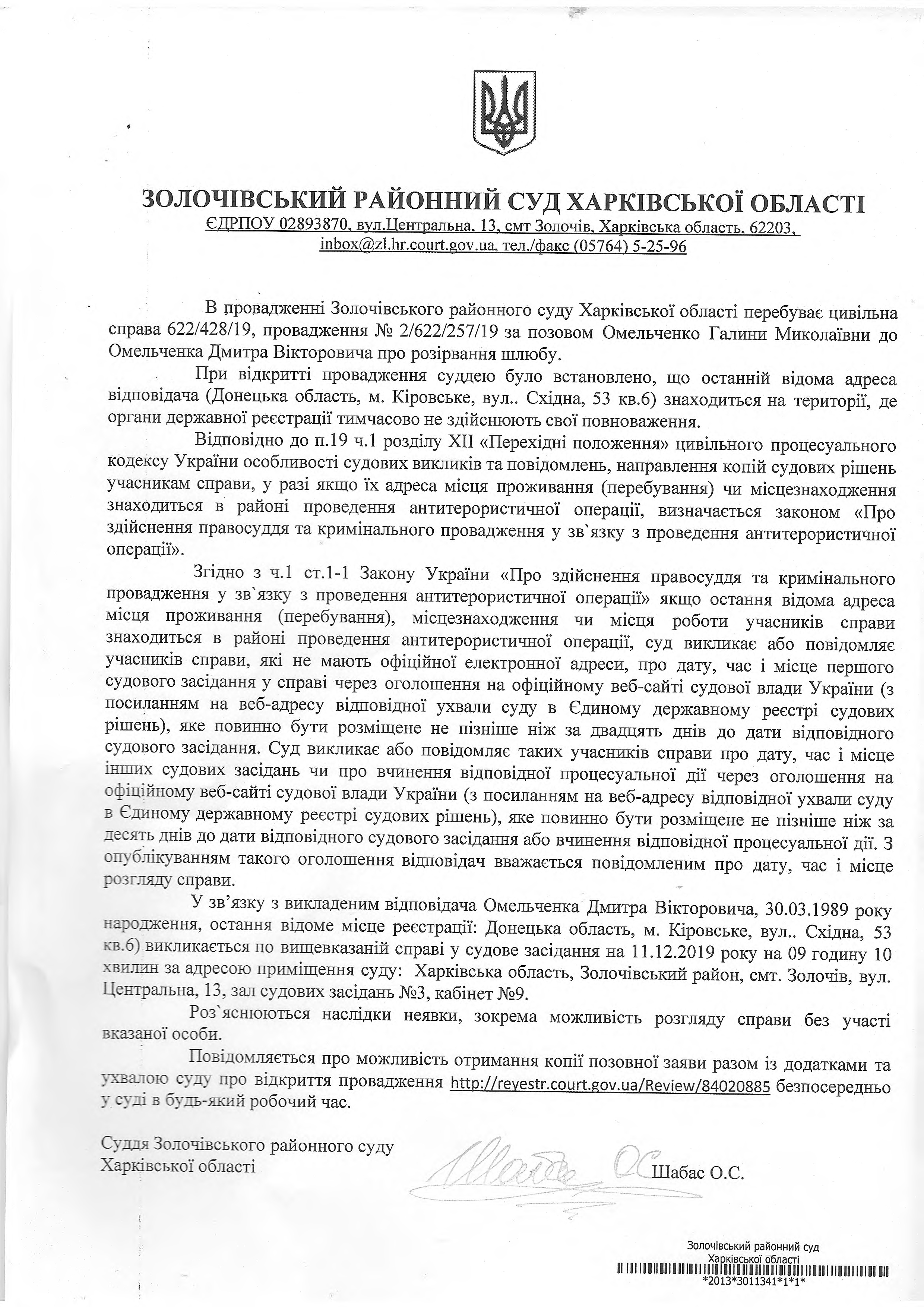 Виклик до суду відповідача Омельченко Дмитра Вікторовича
